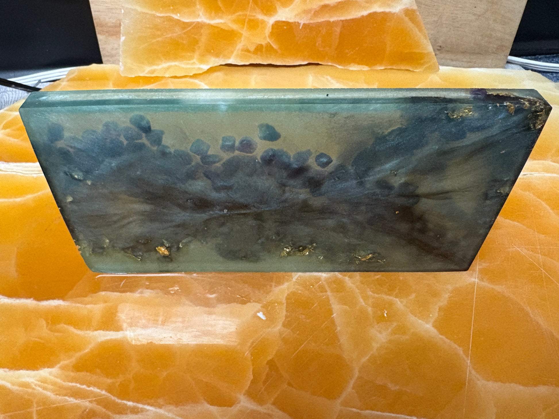 Epoxy resin, real amethyst crystals, gold foil flakes, mica pigments