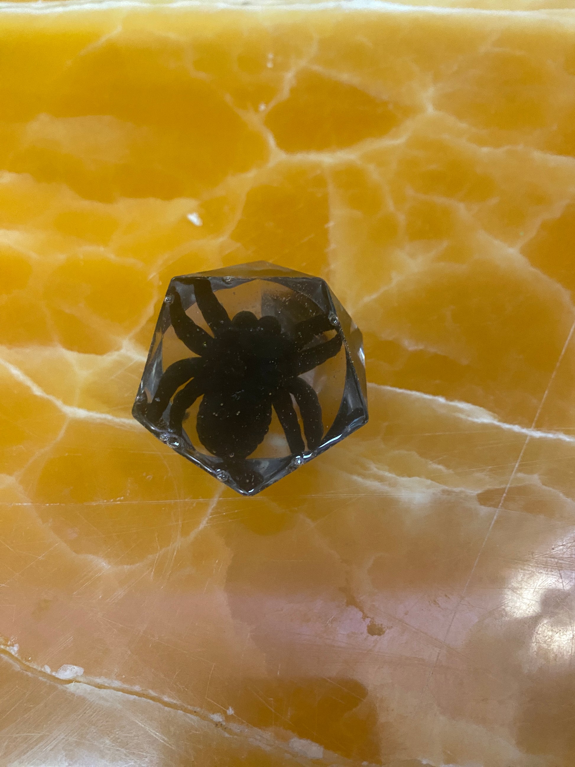 This bold and creepy-cool faux tarantula is permanently sealed inside a hand-poured, crystal-clear resin polygon — a one-of-a-kind Halloween decoration, curiosity collector’s piece, or desk conversation starter.