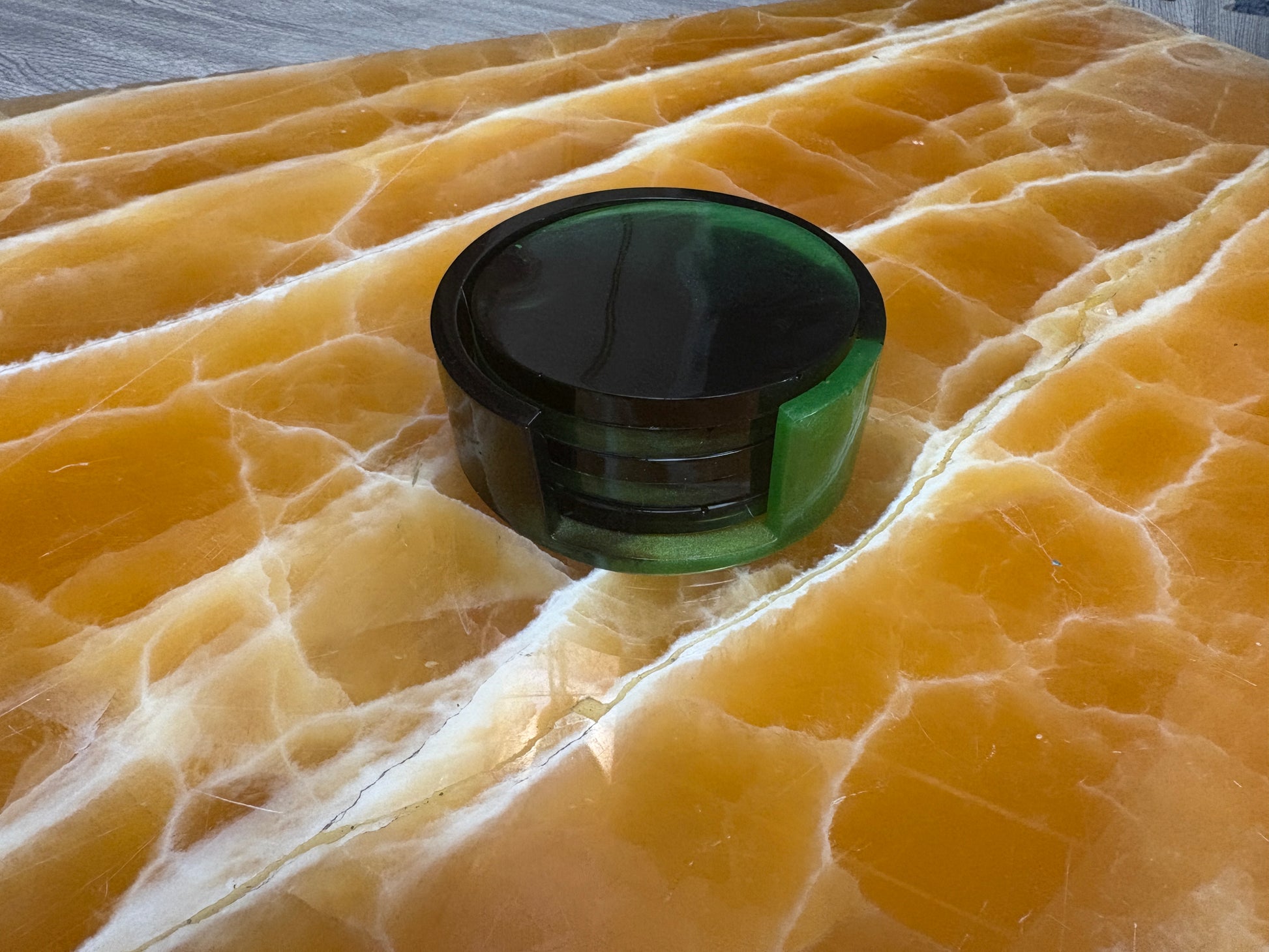 Bring a bold and modern touch to your table with this handmade resin coaster set, featuring five round coasters and a matching holder. Each piece is carefully hand-poured in a deep emerald green and glossy black swirl, creating a stunning marbled effect that makes every set one-of-a-kind.